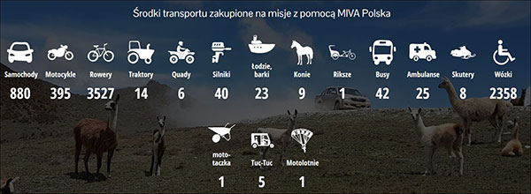 MIVA Polska zrealizowała dotąd tysiące projektów, dzięki którym misjonarze otrzymali m.in. samochody terenowe, ambulanse, busy, a także setki motocykli i tysiące rowerów – pojazdy niezbędne do codziennej posługi. W ciągu 25 lat, dzięki hojności Darczyńców, przekazano na ten cel środki liczone w dziesiątkach milionów złotych!
